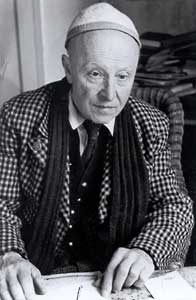 Kubin um 1955, fast en face, an seinem Schreibtisch sitzend, mit Filzhäubchen und Schal, mit kariertem Janker. Reproduktion nach einem Originalfoto von Dr. Schließleder, vorgelegt 1965 (Eiersebner 1965).